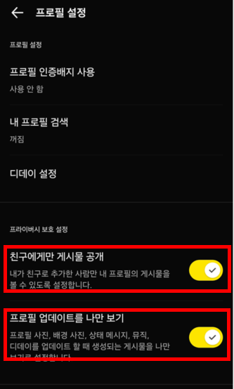 - '프로필 업데이트를 나만 보기' → 반드시 활성화