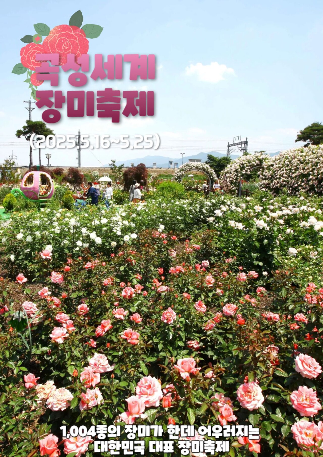 곡성세계장미축제는 매년 5월 전라남도 곡성군 섬진강기차마을에서 열리는 대표적인 봄꽃 축제입니다. 2025년에는 5월 16일부 터 25일까지 개최되며, 1,004종의 유럽산 희귀 장미와 다양한 공연, 체험 프로그램이 마련되어 있습니다. 낮에는 형형색색의 장미 가 만발한 정원을 산책하며 향긋한 봄을 만끽할 수 있고, 밤에는 조명 아래 로맨틱한 분위기를 즐길 수 있습니다. 가족, 연인, 친구 와 함께 방문하여 잊지 못할 추억을 만들어보세요.