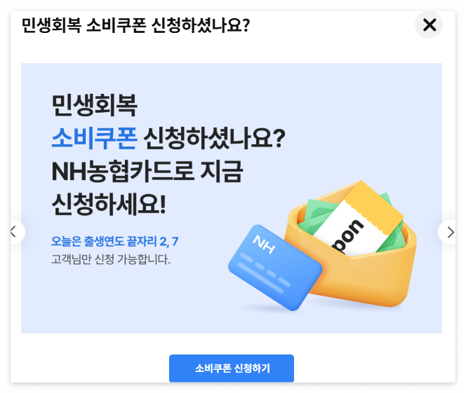 - 온라인: NH농협카드 홈페이지 로그인 → ‘민생회복소비쿠폰’ 배너 클릭 → 본인 인증 후 신청